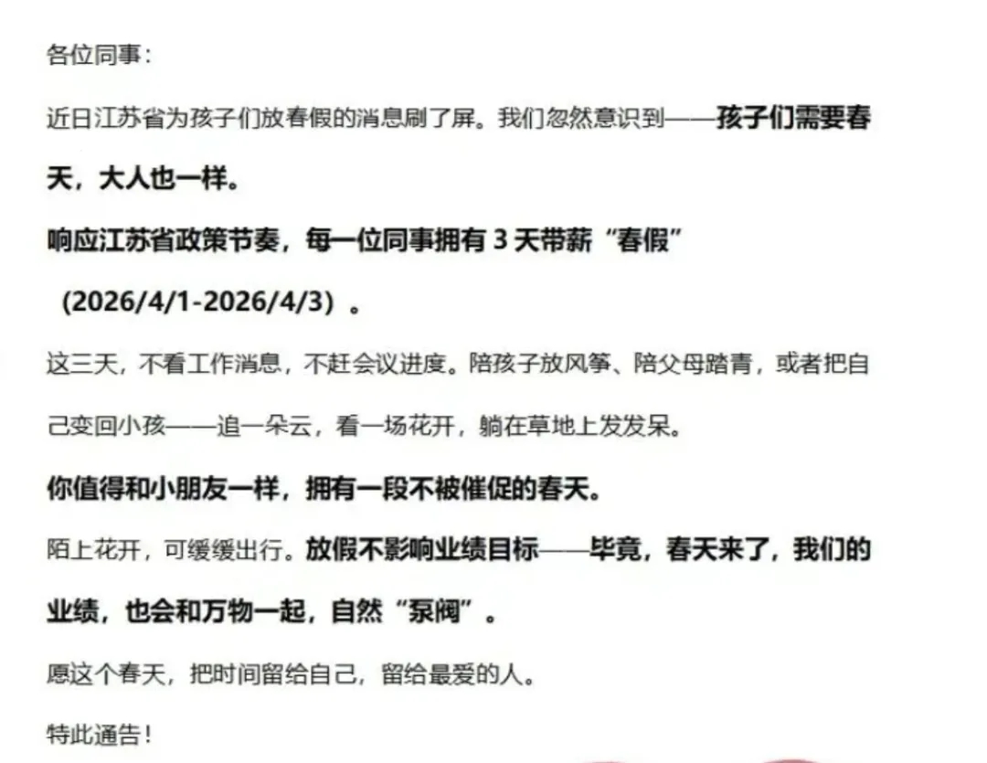 江苏昆山一家只有31名员工的小公司,给全体员工放了三天带薪春假,没有严苛的条条框框,只有一句软乎乎的叮嘱: