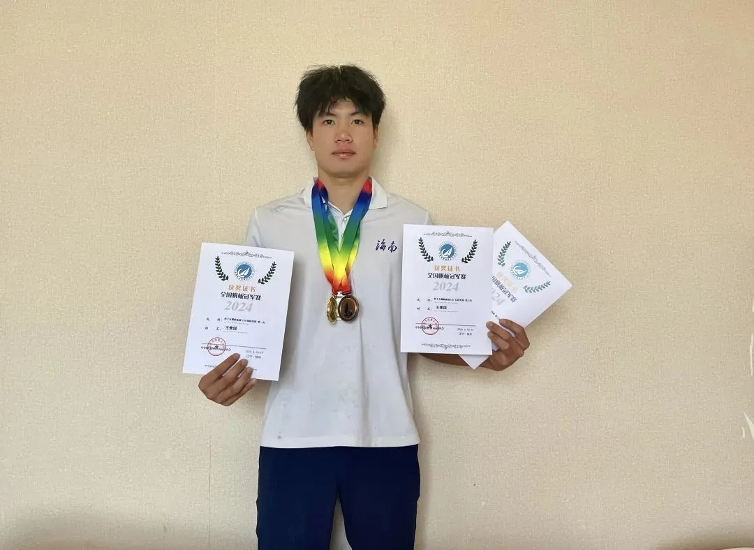 王壹国在2024年全国帆板冠军赛中获1枚金牌、2枚铜牌。图源于保亭旅文微信公众号